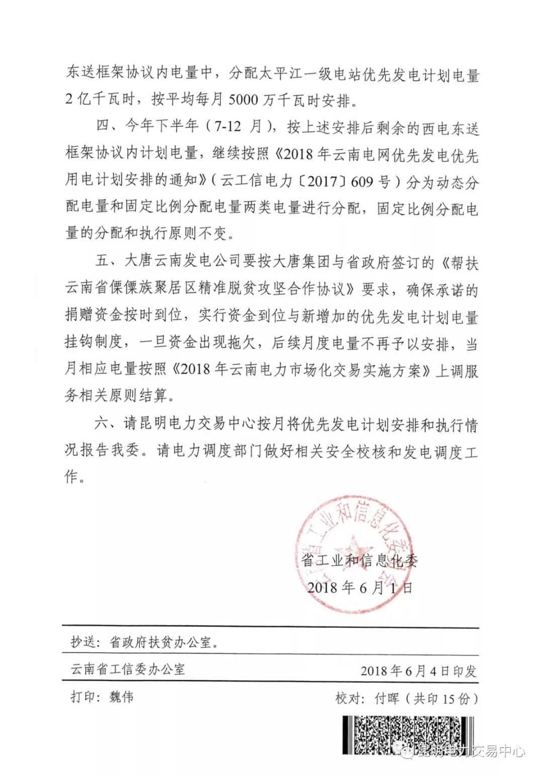 云南省工業(yè)和信息化委關(guān)于調(diào)整2018年下半年西電東送優(yōu)先發(fā)電計(jì)劃的通知