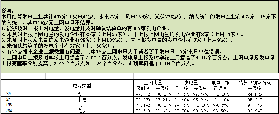 7、本月上網(wǎng)電量上報及時率為82.37%,完整率為99.59%,發(fā)電量上報及時率為81.74%,完整率為99.38%。電量上報正確率為96.27%,結算單確認完整率為92.32%。本月上網(wǎng)電量上報及時率較上月提高了2.07個百分點,發(fā)電量上報及時率較上月提高了4.15個百分點,上網(wǎng)電量及發(fā)電量上報完整率分別提高了2.49個百分點和1.24個百分點,正確率降低了1.04個百分點。