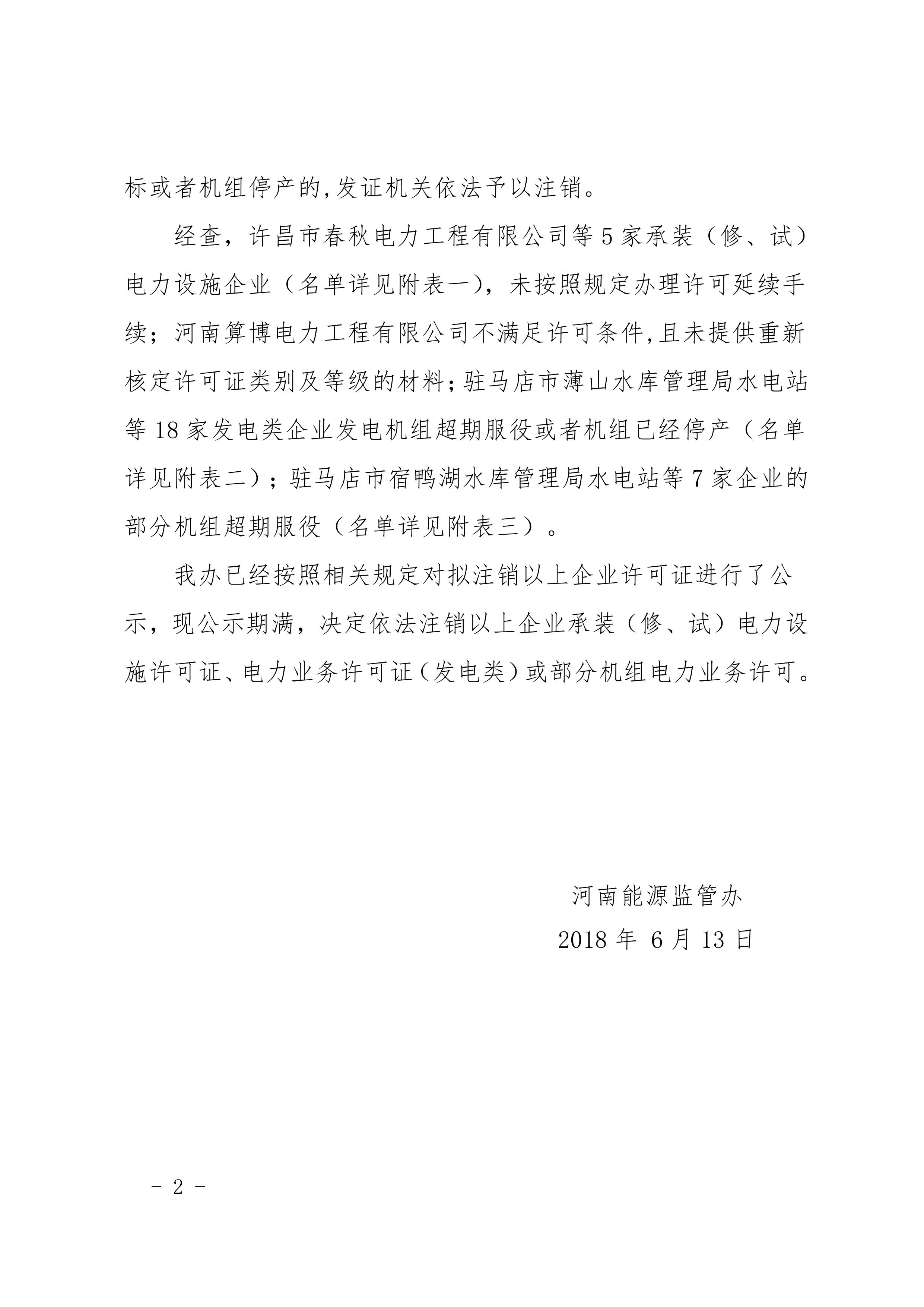 日前國家能源局河南監(jiān)管辦公室發(fā)布了《關于注銷部分企業(yè)許可證的決定》,根據(jù)《承裝(修、試)電力設施許可證管理辦法》(電監(jiān)會28號令)、《電力業(yè)務許可管理規(guī)定》(電監(jiān)會9號令)和《國家能源局關于加強發(fā)電企業(yè)許可監(jiān)督管理有關事項的通知》(國能資質(zhì)[2016]351號)規(guī)定,對未按照規(guī)定辦理許可延續(xù)手續(xù)的許昌市春秋電力工程有限公司等5家承裝(修、試)電力設施企業(yè)、不滿足許可條件,且未提供重新核定許可證類別及等級材料的河南算博電力工程有限公司、發(fā)電機組超期服役或者機組已經(jīng)停產(chǎn)的駐馬店市薄山水庫管理局水電站等18家發(fā)電類企業(yè)、部分機組超期服役的駐馬店市宿鴨湖水庫管理局水電站等7家電力企業(yè),進行擬注銷企業(yè)許可證的公示。