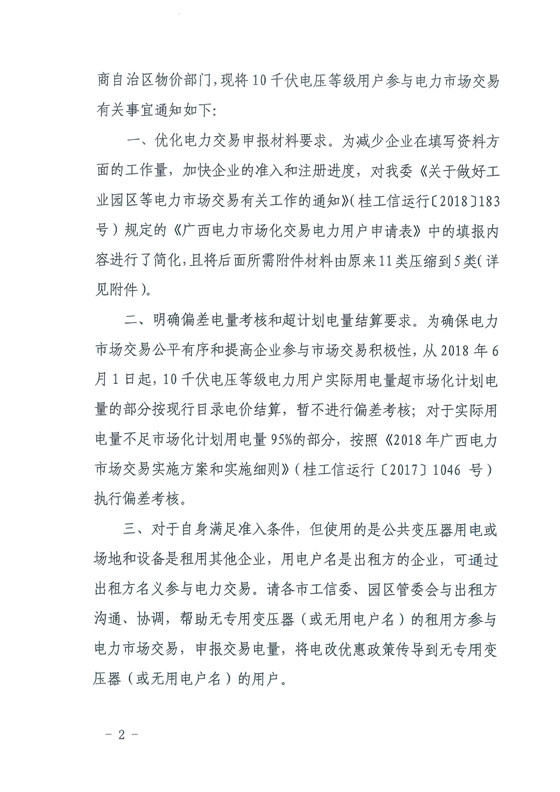 廣西工信委日前發(fā)布了《自治區(qū)工業(yè)和信息化委關(guān)于明確10千伏電壓等級(jí)用戶參與電力市場(chǎng)交易有關(guān)事宜的通知(桂工信運(yùn)行[2018]525號(hào))》,為確