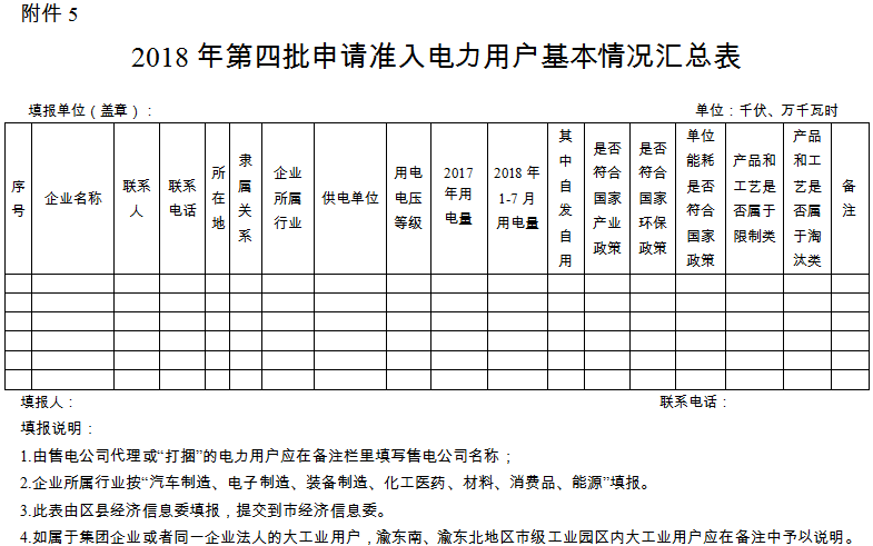 3.區(qū)縣(自治縣)經(jīng)濟(jì)信息委填寫2018年第四批申請(qǐng)準(zhǔn)入電力用戶基本情況匯總表(見附件5),其中,對(duì)售電公司代理或“打捆”的電力用戶,屬于集團(tuán)企業(yè)或者同一企業(yè)法人的大工業(yè)用戶,渝東南、渝東北地區(qū)市級(jí)工業(yè)園區(qū)內(nèi)大工業(yè)用戶需在備注中予以說明。