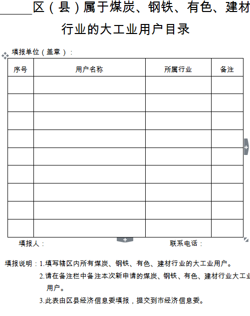 (三)請(qǐng)各區(qū)縣(自治縣)經(jīng)濟(jì)信息委認(rèn)真梳理轄區(qū)內(nèi)屬于煤炭、鋼鐵、有色、建材四個(gè)行業(yè)的大工業(yè)用戶,建立四個(gè)行業(yè)用戶目錄。