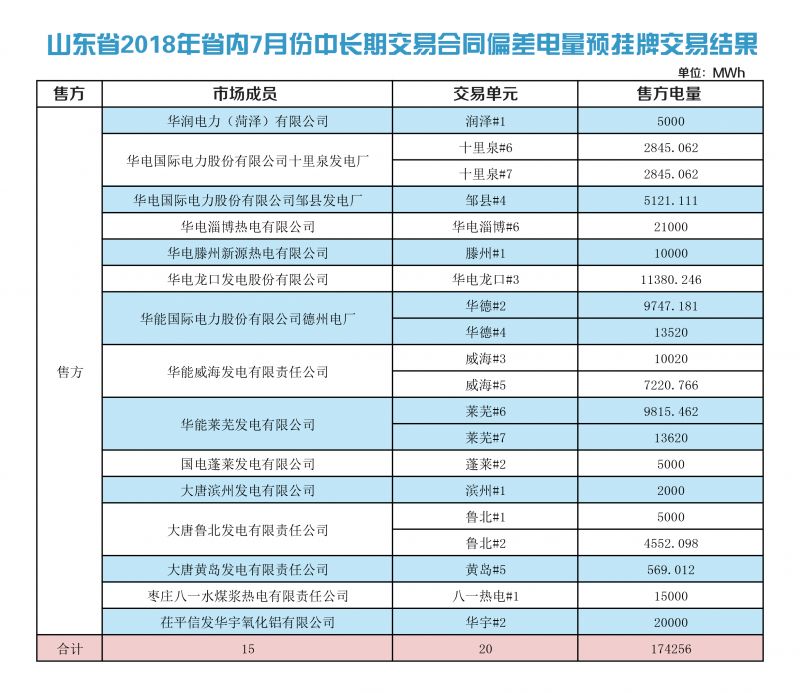 山東2018年7月份省內(nèi)中長期交易合同偏差電量預(yù)掛牌交易結(jié)果