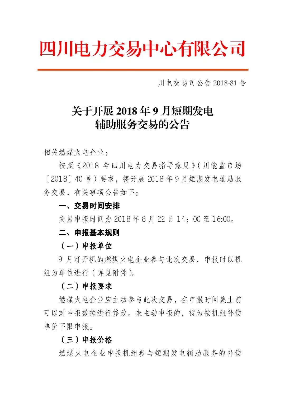 公告 | 四川關(guān)于開展2018年9月短期發(fā)電輔助服務(wù)交易的公告