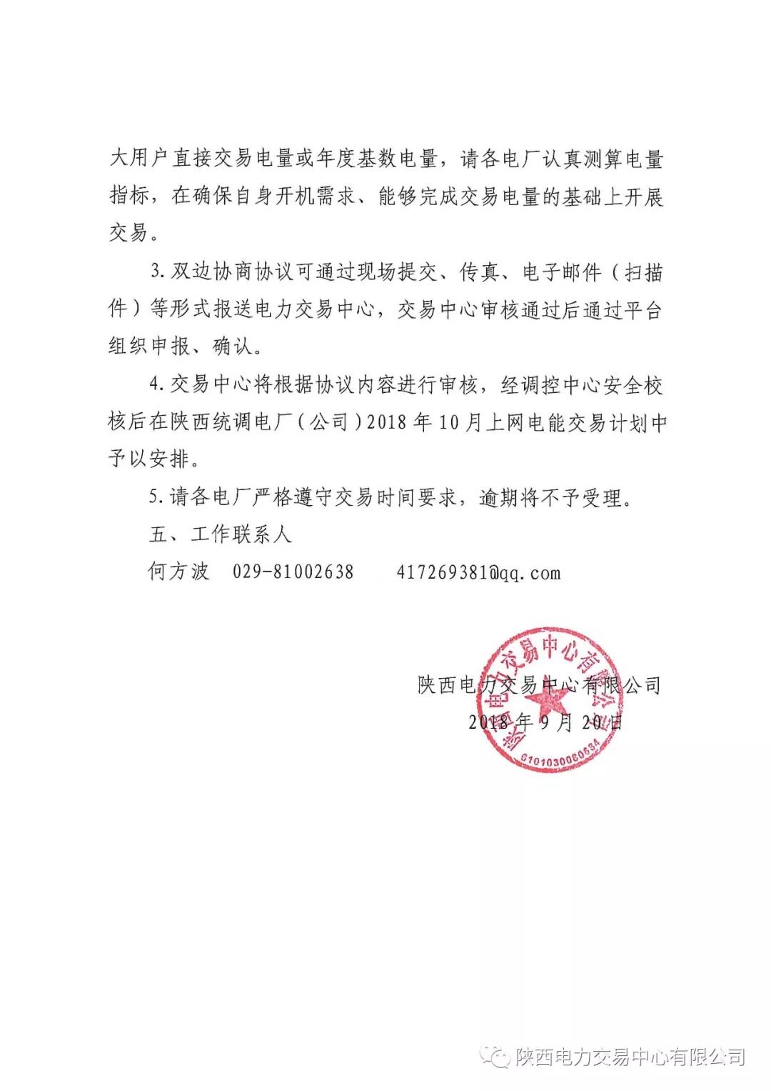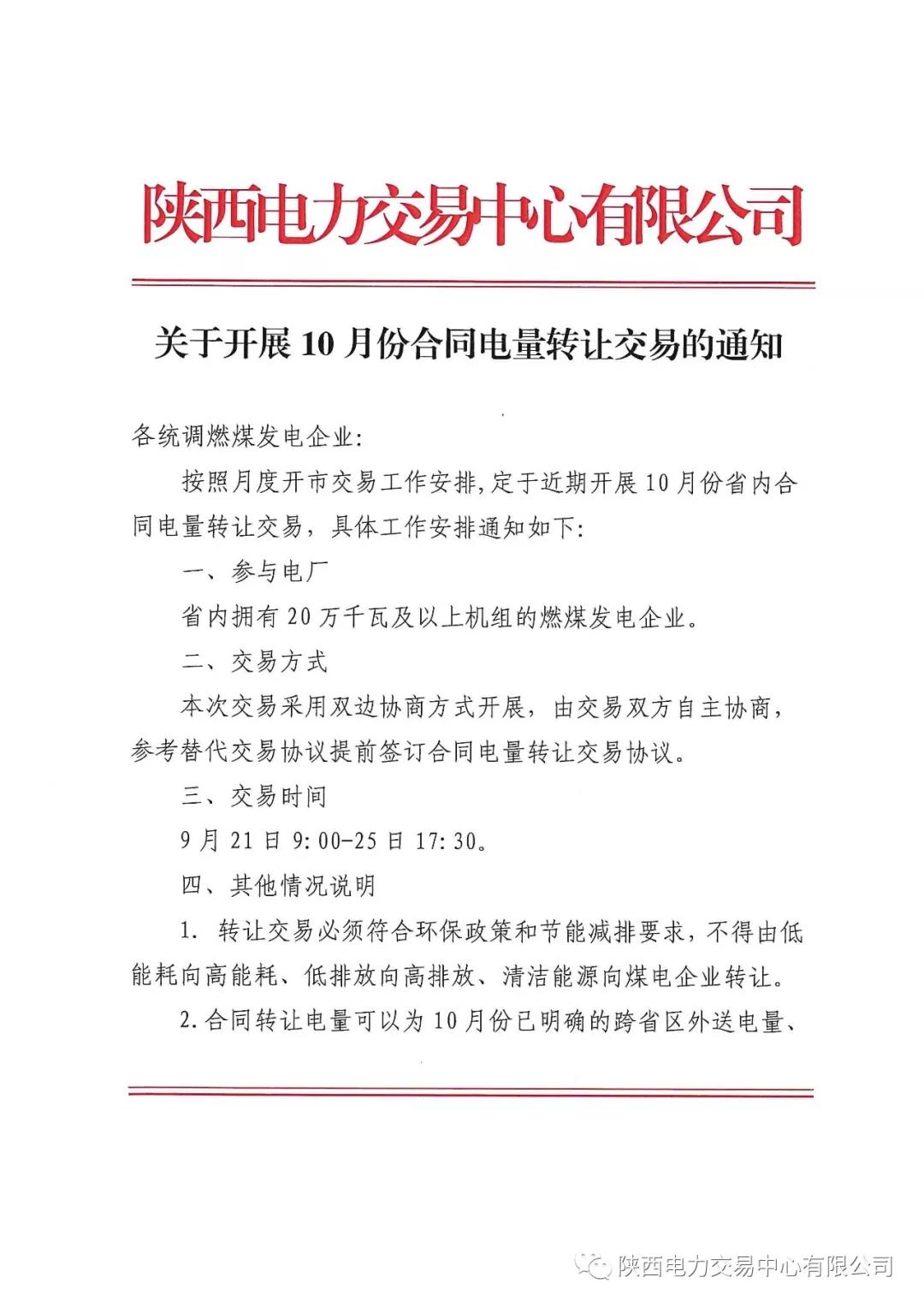 陜西關(guān)于開展10月份合同電量轉(zhuǎn)讓交易的通知