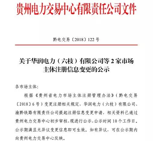 貴州關(guān)于華潤電力(六枝)有限公司等2家市場主體注冊信息變更的公示