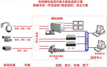 解決方案二:對于傳統(tǒng)模擬監(jiān)控(已建或新建),選擇重點(diǎn)、高危監(jiān)控目標(biāo)和場所,針對此部分圖像進(jìn)行分析功能,主動(dòng)監(jiān)控,將預(yù)警、警情實(shí)時(shí)發(fā)給模擬矩陣和DVR,完成快速切換和錄像,選擇智能分析硬盤錄像機(jī),解決方案如圖所示: