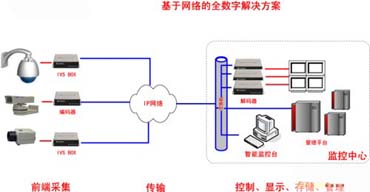解決方案三、對于網(wǎng)絡(luò)的數(shù)字化監(jiān)控系統(tǒng),同樣選擇重點(diǎn)、高危監(jiān)控目標(biāo)和場所,直接在前端選擇智能視頻服務(wù)器(IVS BOX),主動(dòng)監(jiān)控,將預(yù)警、警情實(shí)時(shí)發(fā)給后端管理平臺(tái),完成快速切換和錄像,解決方案如圖所示:
