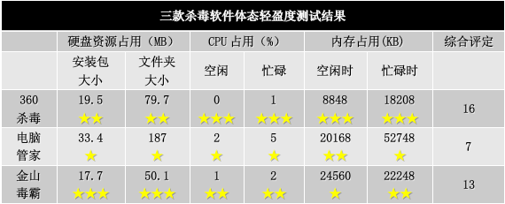 在“體態(tài)輕盈度”測(cè)試中,給出六項(xiàng)有關(guān)軟件系統(tǒng)資源占用的測(cè)試指標(biāo)。每項(xiàng)指標(biāo)的滿(mǎn)分為三顆星,占用資源越少得分越高,排名第一的軟件即獲得滿(mǎn)分三星、第二名兩星,第三名一星。最終綜合六項(xiàng)的測(cè)試結(jié)果,給出每款軟件最后的成績(jī)(分?jǐn)?shù)越高成績(jī)?cè)胶?。