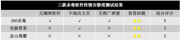 三款殺毒軟件中,360殺毒相對(duì)更加“安靜”,只是在卸載時(shí)需要選擇原因。電腦管家排在第二,在安裝時(shí)會(huì)捆綁安裝金山毒霸,使用時(shí)則會(huì)彈窗提示軟件升級(jí)。而“最外向”的當(dāng)屬金山毒霸,安裝時(shí)會(huì)捆綁安裝金山瀏覽器,而且會(huì)修改IE主頁(yè)并彈出廣告窗口。
