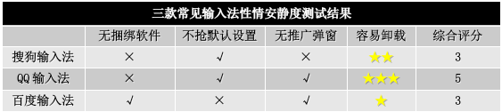 從測(cè)試結(jié)果來(lái)看,QQ輸入法的表現(xiàn)更好,只是出現(xiàn)了捆綁安裝軟件的情況,卸載也更加容易。而搜狗輸入法則在彈窗上敗下陣來(lái),并且也出現(xiàn)了捆綁安裝的情況。而百度輸入法雖然無(wú)捆綁軟件,但是卻會(huì)修改輸入法默認(rèn)設(shè)置。
