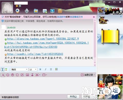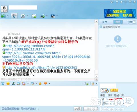溫馨提示:在淘寶購(gòu)物請(qǐng)不要使用其他聊天工作跟買/賣家進(jìn)行溝通,因?yàn)槠渌脚_(tái)的聊天記錄不可以作為淘寶購(gòu)物憑證,而且目前大部分騙子都是通過(guò)旺旺誘導(dǎo)會(huì)員到QQ上進(jìn)行交易,然后再向會(huì)員發(fā)送淘寶的釣魚鏈接。