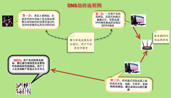 據(jù)趙昱表示,黑客攻擊家用路由器一般有三個(gè)步驟:第一,破解網(wǎng)民家里的WiFi密碼;第二,接入WIFI之后,再破解路由器管理后臺(tái)的賬號(hào)和密碼,獲得路由器管理權(quán);最后,在路由器中植入后門程序,竊取網(wǎng)民上網(wǎng)信息,或者篡改路由器DNS設(shè)置,使得網(wǎng)民在不知情的情況下訪問(wèn)釣魚欺詐網(wǎng)站。