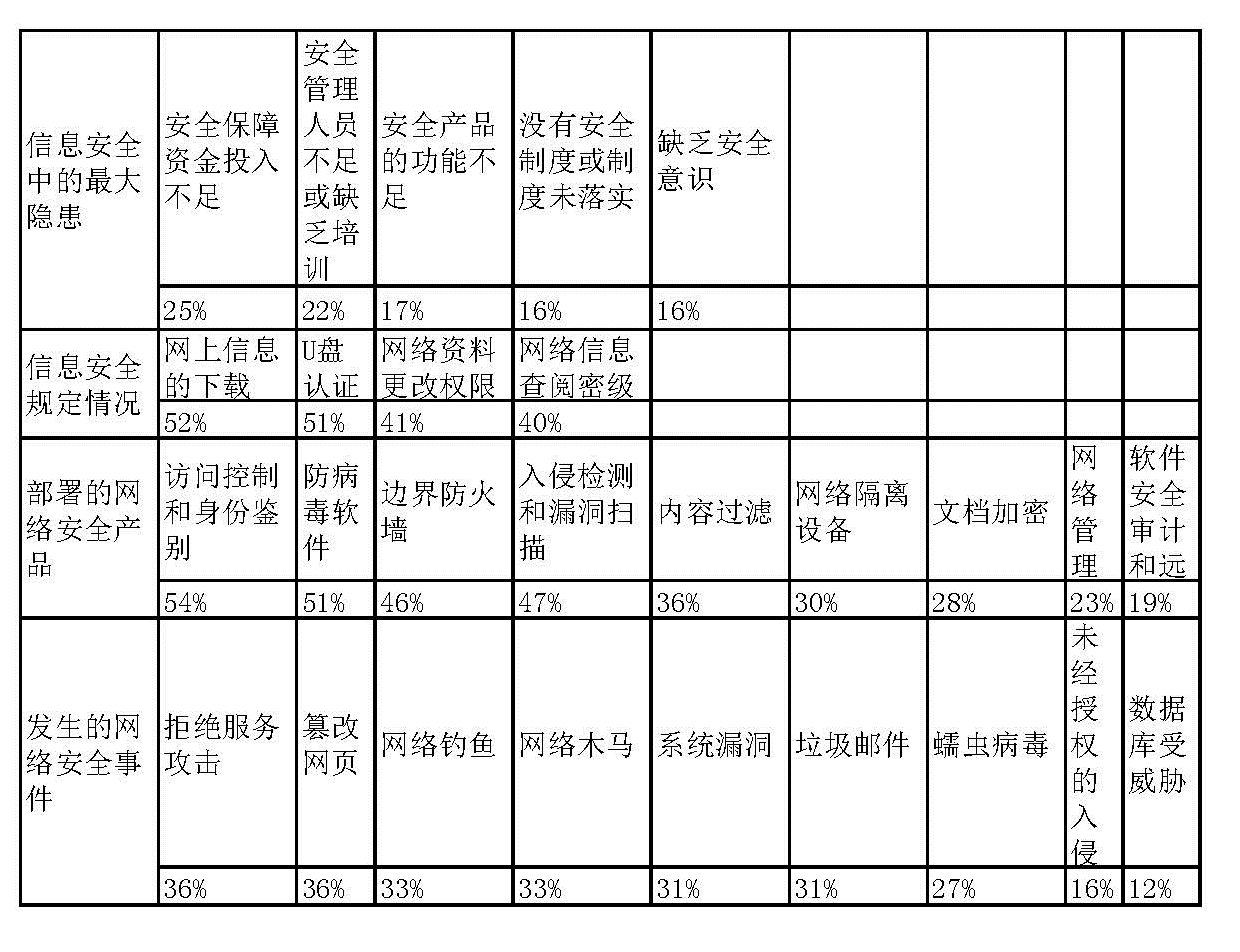 怎樣才能保證我們信息的保密、完整和可用性呢?眾所紛云的口頭禪 “信息安全”到底是什么?我們曾經(jīng)作過調(diào)查:70%的人認(rèn)為“信息安全太廣義了,包含的內(nèi)容太多。如果指定哪方面的安全,我們加強重視和防范不就行了”,30%的人認(rèn)為“信息安全問題,國家有專門的保障體系,我們只是在技術(shù)上采取策略和措施,將對信息的危害降到最低的程度。這是我們應(yīng)盡的職責(zé)。”如表1所示。
