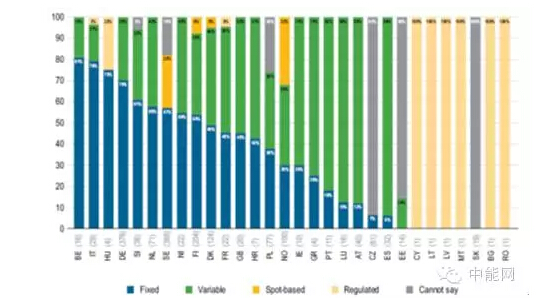 圖6各國代碼后的數(shù)字是交易品種。在已經簽署的售電合同中,總體上固定電價品種比例較高,有851個品種,葡萄牙、比利時、意大利、匈牙利和德國首都以固定電價為主;變化電價品種有666個,含基于現(xiàn)貨價格的品種,克羅地亞、愛爾蘭、盧森堡、挪威和西班牙則以價格變化品種為主。