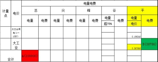 2、平電價里面購電基準價仍顯示0.39886,假設電量A合計為100000千瓦時,優(yōu)惠電費合計為0.011元/千瓦時。算法為表格中電量電費合計中紅框A內數(shù)值*購電基準價-綠色底B數(shù)據(jù)等于總優(yōu)惠金額。