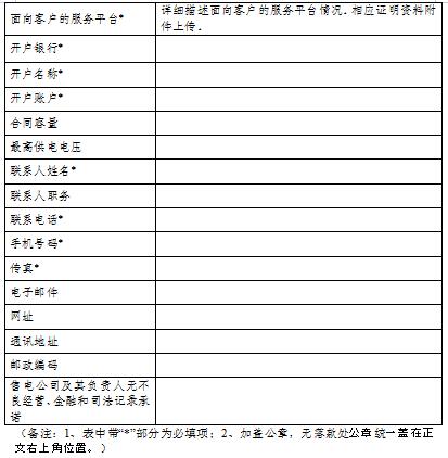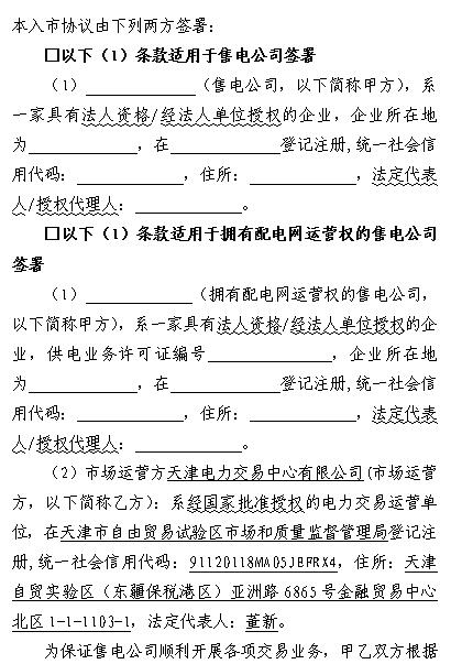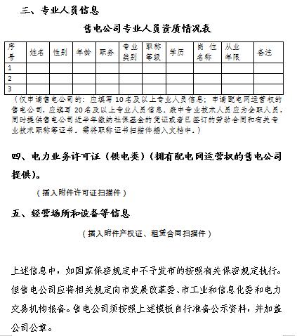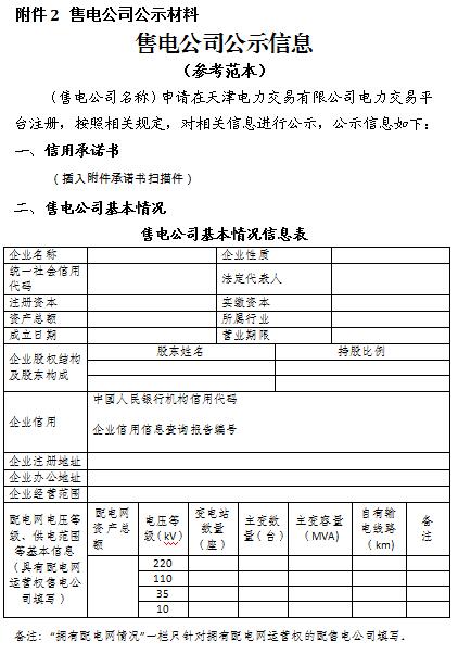 第三條 在其他電力交易機(jī)構(gòu)注冊的售電公司需按照天津市售電公司準(zhǔn)入條件補(bǔ)充以下材料:《授權(quán)委托書》、《售電公司信用承諾書》、《售電公司注冊申請書》、《售電公司注冊信息表》、《專業(yè)人員資質(zhì)表》,以及需要變更的《資產(chǎn)證明》、《經(jīng)營場所證明文件》等,另需將《信用承諾書》、《注冊申請書》、《注冊信息表》、《專業(yè)人員資質(zhì)表》及需要變更的有關(guān)資料合并成一個(gè)文件(PDF格式,統(tǒng)一命名為“***售電公司天津公示材料”)。相關(guān)表格填報(bào)要求,見附件1到附件13。