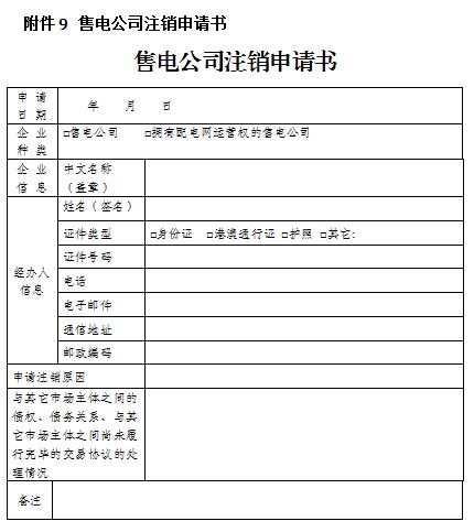 第九條 售電公司注冊信息的變更、注銷等事項(xiàng)均按照實(shí)施細(xì)則有關(guān)規(guī)定執(zhí)行,模板見附件8、附件9。