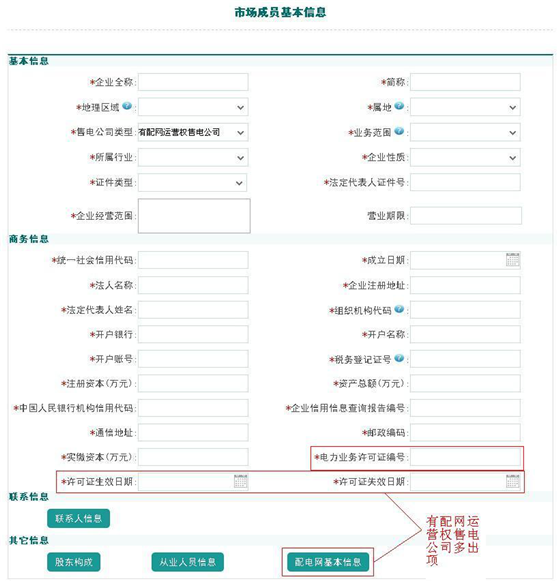 售電公司需要填寫市場成員的基本信息,包括基本信息、商務(wù)信息、聯(lián)系信息等,打紅星的必填項(xiàng),不打紅星的為非必填項(xiàng),同時(shí)上傳相關(guān)附件信息。
