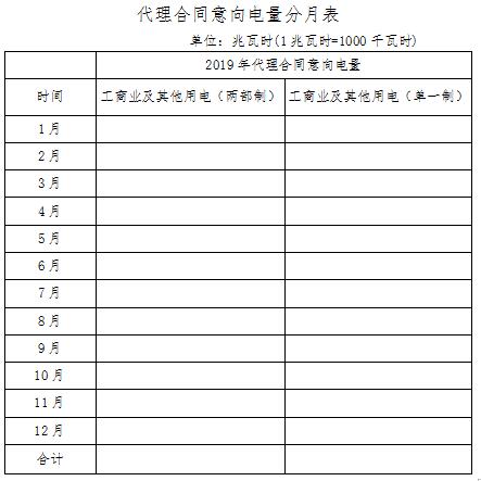 3.3 2019年度,甲方代理合同意向電量_______兆瓦時,其中工商業(yè)及其他用電(兩部制)電量_______兆瓦時,工商業(yè)及其他用電(單一制)電量_______兆瓦時,需求電量按下表分月。