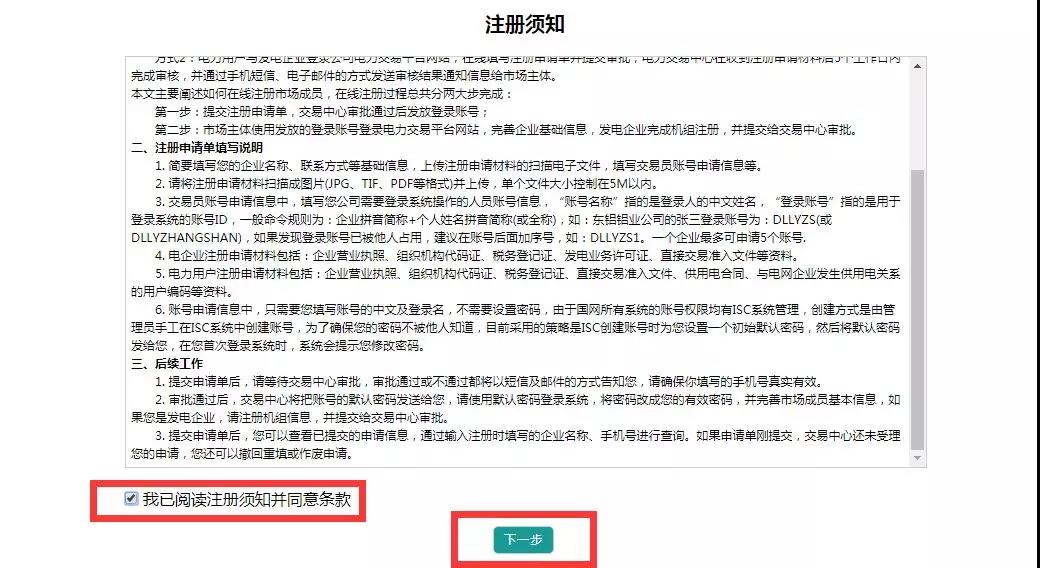 完整閱讀平臺(tái)注冊(cè)須知后,勾選“我已閱讀注冊(cè)須知并同意條款”,并點(diǎn)擊下一步。