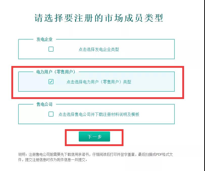 選擇電力用戶(零售用戶)類型,然后點(diǎn)擊下一步進(jìn)行電力用戶注冊(cè)。