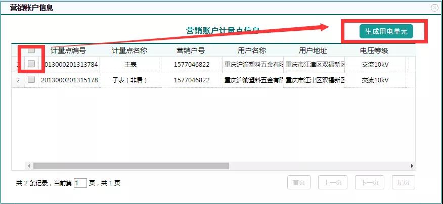 查詢出該戶號(hào)下的所有計(jì)量點(diǎn)信息[不一定所有計(jì)量點(diǎn)都是參加直接交易,只勾選要參加直接交易的計(jì)量點(diǎn),然后點(diǎn)擊生成用電單元(哪些計(jì)量點(diǎn)參加直接交易需咨詢營(yíng)銷 95598,可勾選多個(gè)計(jì)量點(diǎn)一起生成用電單元,一個(gè)計(jì)量點(diǎn)生成一個(gè)用電單元,勾選多個(gè)計(jì)量點(diǎn)可生成多個(gè)用電單元)]。