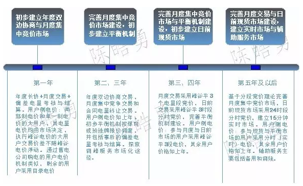 4.第五年及以后:完善月度交易與日前現(xiàn)貨市場(chǎng)建設(shè),建立實(shí)時(shí)市場(chǎng)與輔助服務(wù)市場(chǎng)