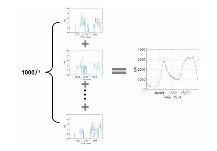 你可以嘗試再用另外1000個家庭的負荷疊加一次,差別跟上圖不會太大。這種現(xiàn)象就是由用戶用電習慣的隨機分布性所造成的。