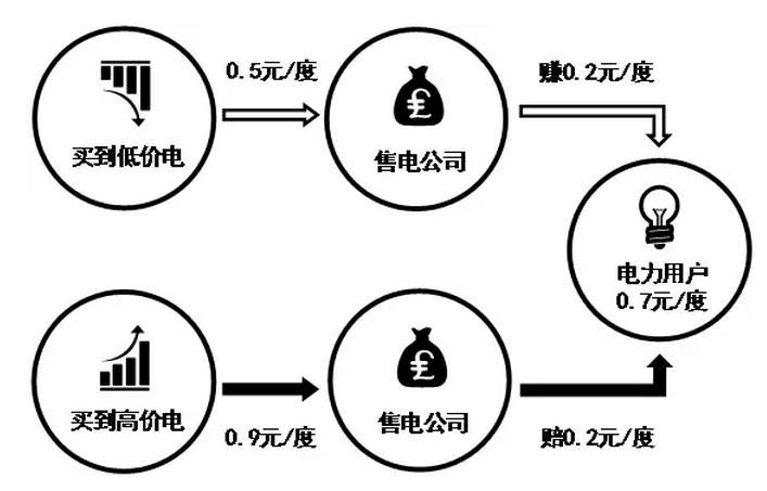 3、如果售電公司競到的電價比0.8元/度低,就可以盈利,例如0.75/度,雖然比0.7元/度的平均價高,但售電公司還是能賺0.05元/度。