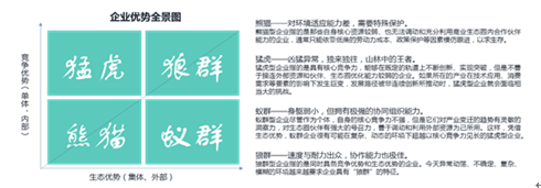 長江商學(xué)院的廖建文和崔之瑜于2016年7月,在《哈佛商業(yè)評論》中文版發(fā)表的《企業(yè)優(yōu)勢矩陣:競爭VS生態(tài)》一文中,首次提出了企業(yè)“生態(tài)優(yōu)勢”的理念。這一理念認為,“企業(yè)的優(yōu)勢不僅僅來源于內(nèi)部價值鏈活動的優(yōu)化和資源能力的積累,還來源于對外部資源的有效利用,也就是企業(yè)組合商業(yè)生態(tài)圈元素,協(xié)調(diào)、優(yōu)化生態(tài)圈內(nèi)伙伴關(guān)系的能力”。該文中進一步將“生態(tài)優(yōu)勢”和“以核心競爭力”為基礎(chǔ)的“競爭優(yōu)勢”抽象為兩個維度,并依據(jù)企業(yè)在這兩個維度中的優(yōu)劣勢,將企業(yè)分為“熊貓”、“猛虎”、“蟻群”和“狼群”這四種類型,詳見下圖。