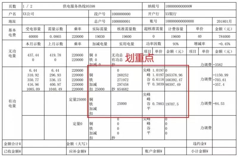 大家可能注意到,在紅框第二行,扣了25000千瓦時(shí),這個(gè)電量,就是大家的非生產(chǎn)用電量了,它和峰平谷電量相加,就是當(dāng)月的總用電量。但是非生產(chǎn)用電的價(jià)格和峰平谷價(jià)格不一樣,因此單獨(dú)列出。