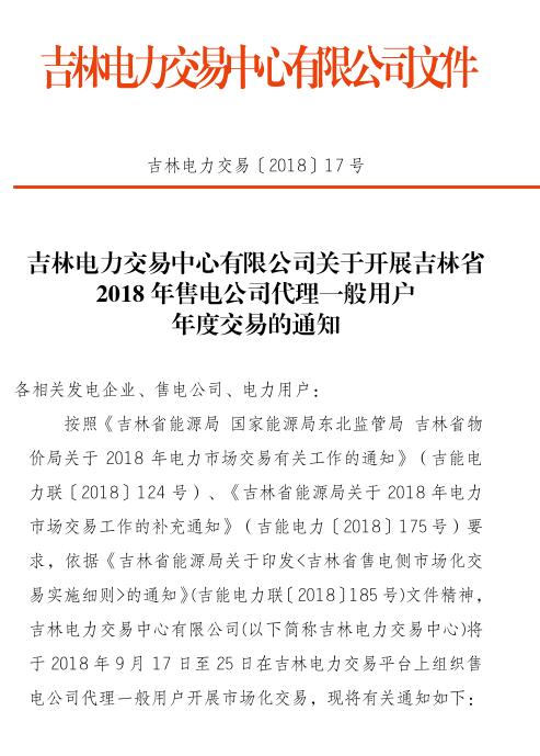 吉林2018年售電公司代理一般用戶年度交易:采取雙邊自主協(xié)商方式