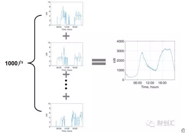 你在上圖里可以看到單一用戶的用電頻率變得更高(負(fù)載更緊密了),并且需求峰值更大了(從天然氣供暖的單戶4-5kW電力峰值提升至了這里的8kW)。所以售電公司通過給用戶推薦新的電氣設(shè)備,以提升售電量。并且加高了用電頻率,使疊加后的負(fù)載潛在的變化更小(可以看到右邊的總負(fù)載曲線更加平滑了),從而降低自身風(fēng)險(xiǎn)。