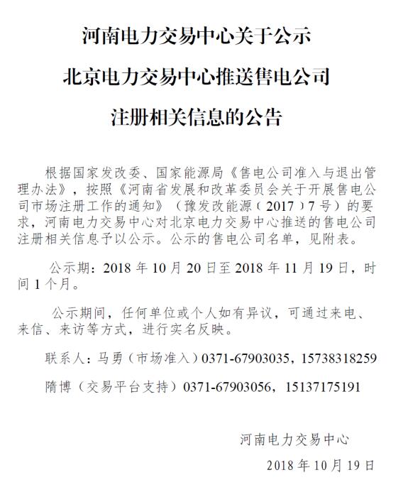 河南電力交易中心日前發(fā)布了《關(guān)于公示北京電力交易中心推送售電公司注冊(cè)相關(guān)信息的公告(2018年10月19日)》,公示北京推送的河南晟之威電力銷售有限公司1家售電公司,公示期為2018年10月20日至11月19日,時(shí)間一個(gè)月。