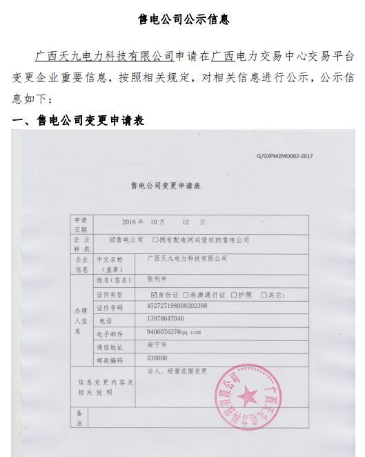 廣西電力交易中心日前發(fā)布了《關(guān)于廣西廣投乾豐售電有限責(zé)任公司、廣西天九電力科技有限公司等五家售電公司重要信息變更情況的公示》,公示申請(qǐng)重要信息變更的廣西廣投乾豐售電有限責(zé)任公司等5家售電公司,公示期為2018年10月24日至2018年11月23日,公示期1個(gè)月。