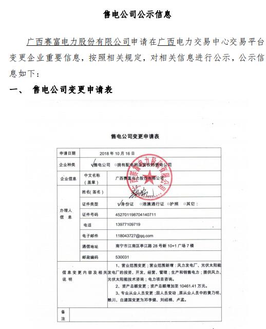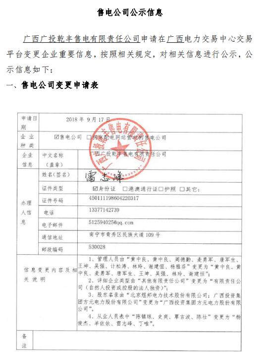 關(guān)于廣西廣投乾豐售電有限責(zé)任公司、廣西天九電力科技有限公司等五家售電公司重要信息變更情況的公示