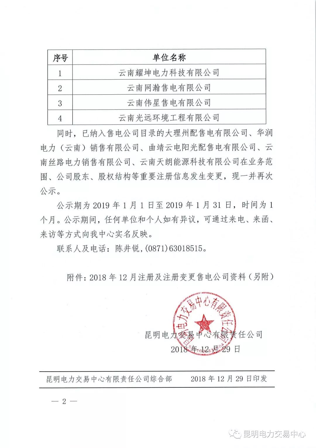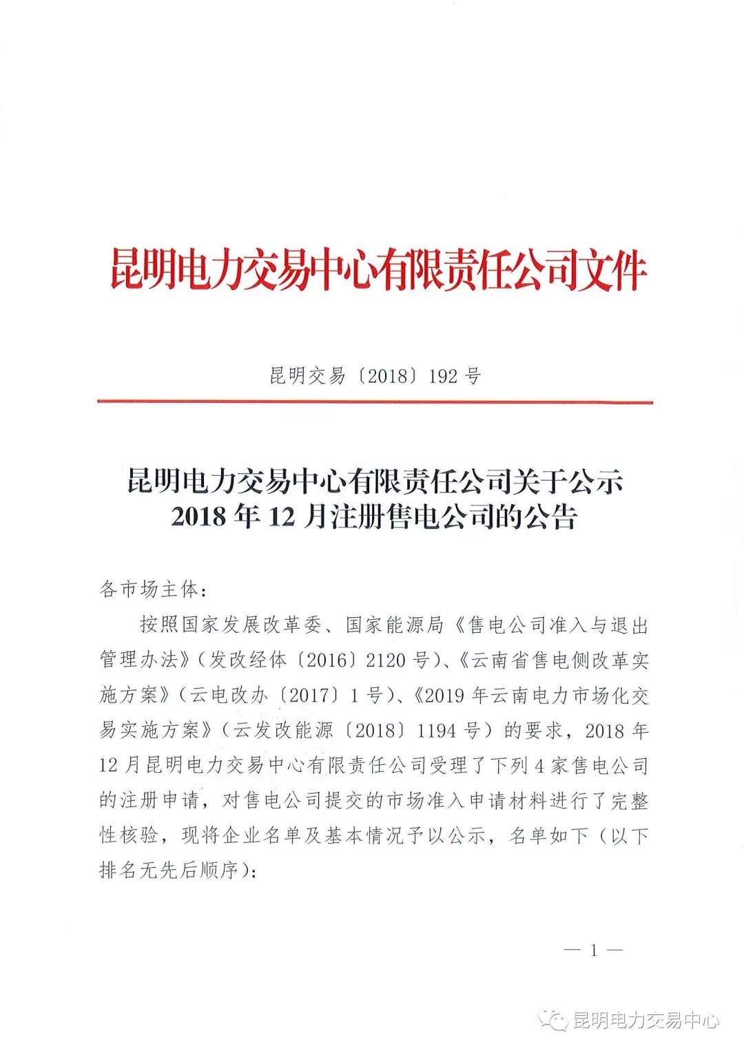 昆明發(fā)布了《關(guān)于公示2018年12月注冊(cè)售電公司的公告》