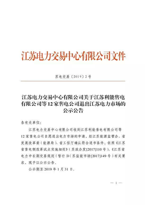 2018年1月17日,江蘇電力交易中心有限公司發(fā)布了關于江蘇利能售電有限公司等12家售電公司推出市場的公示公告。