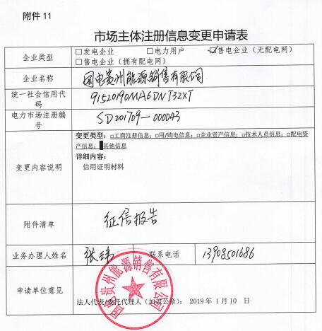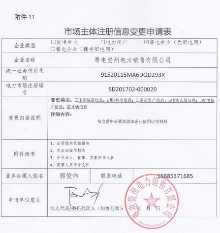 因凱里產(chǎn)投聚源配售電有限公司、粵電貴州電力銷(xiāo)售有限公司、貴州惠燃能源科技有限公司、貴州華網(wǎng)電力銷(xiāo)售有限公司、成都鐵路局貴陽(yáng)北供電段、成都鐵路局貴陽(yáng)供電段、國(guó)電貴州能源銷(xiāo)售有限公司、貴州電網(wǎng)有限責(zé)任公司安順市郊供電局、貴州電網(wǎng)有限責(zé)任公司安順鎮(zhèn)寧供電局等9家市場(chǎng)主體提出注冊(cè)信息變更申請(qǐng),按照《貴州省電力中長(zhǎng)期交易規(guī)則(試行)》(黔監(jiān)能市場(chǎng)〔2017〕112 號(hào))、《貴州省電力市場(chǎng)主體注冊(cè)管理辦法》(黔電交易〔2018〕154號(hào))相關(guān)規(guī)定,以上9家市場(chǎng)主體提交注冊(cè)信息變更資料通過(guò)貴州電力交易中心初步審核。
