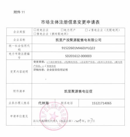 關(guān)于凱里產(chǎn)投聚源配售電有限公司等9家市場(chǎng)主體注冊(cè)信息變更公示的通知(黔電交易〔2019〕11號(hào))