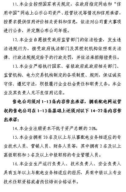8.“營業(yè)執(zhí)照”中“企業(yè)經(jīng)營范圍”項(xiàng)中應(yīng)包含“電力供應(yīng)”、“售電”、“供電”、“電力銷售”等類似內(nèi)容。營業(yè)執(zhí)照中無“經(jīng)營范圍”項(xiàng)的,應(yīng)打印商事主體信息公示平臺中所列經(jīng)營范圍,加蓋公章后一并提交。