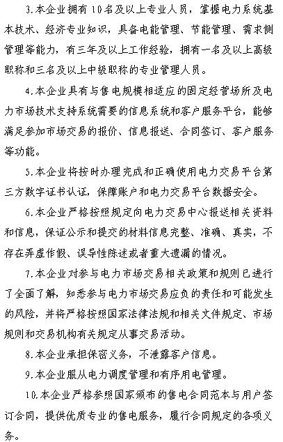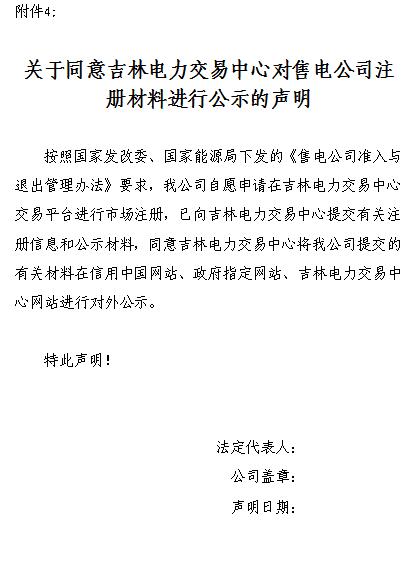 4.關(guān)于同意吉林電力交易中心對售電公司注冊材料進(jìn)行公示的聲明按照附件4樣式填寫,并進(jìn)行簽署、蓋章。