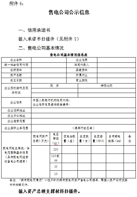 6. 公示信息材料需按照附件6公示信息模板編寫,需將相關(guān)掃描文件插入到WORD文檔中,最后形成完整文檔(填寫公示材料中的經(jīng)營場所和設(shè)備等信息時,既要有文字描述,同時要插入場所證明、售電業(yè)務(wù)信息管理或客戶服務(wù)平臺登錄界面及相關(guān)功能界面截圖)。
