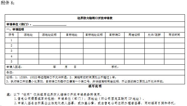 14.“邊界防火墻端口開放申請表”:由于一些售電公司登錄系統(tǒng)的互聯(lián)網(wǎng)IP地址,在省電力公司安全掃描時可能被認(rèn)為有安全隱患問題,其IP地址可能會被封禁,導(dǎo)致不能登錄注冊,所以需要填寫“邊界防火墻端口開放申請表”,提供互聯(lián)網(wǎng)固定IP地址。具體按照附件8樣式填寫,并進(jìn)行簽署、蓋章。