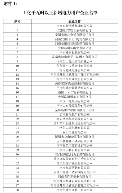 河南65家1億千瓦時以上新增電力用戶企業(yè)(附名單)