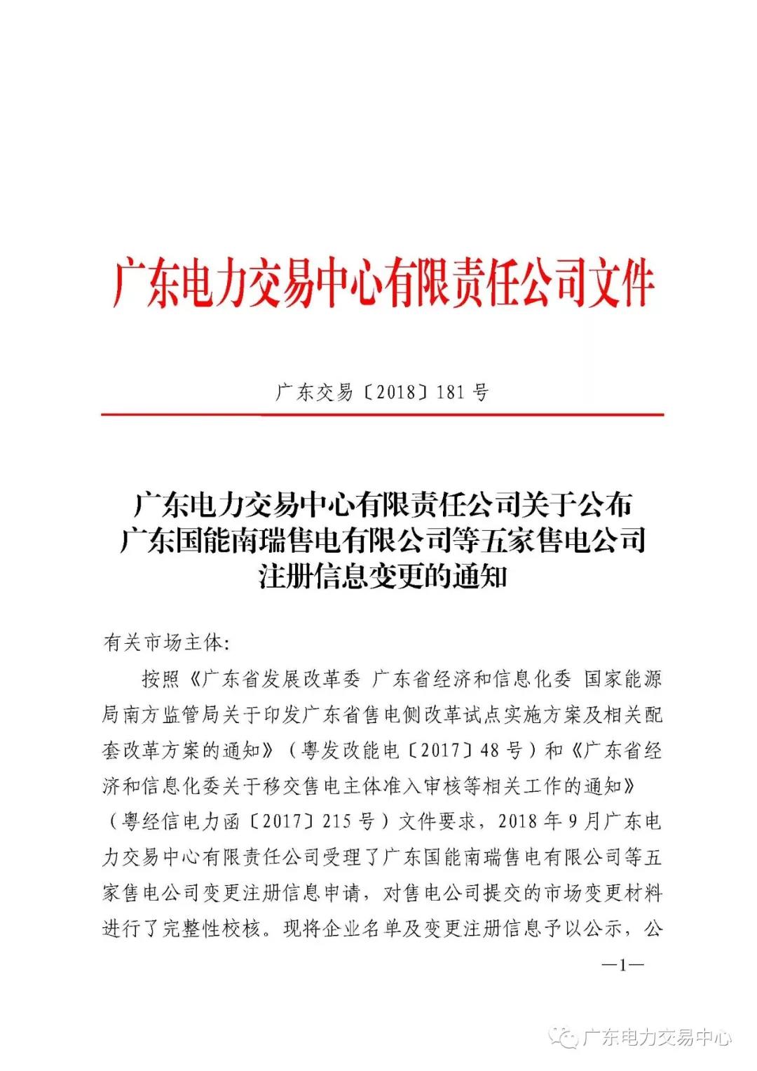 通知 | 關(guān)于公布廣東國能南瑞售電有限公司等五家售電公司注冊信息變更的通知