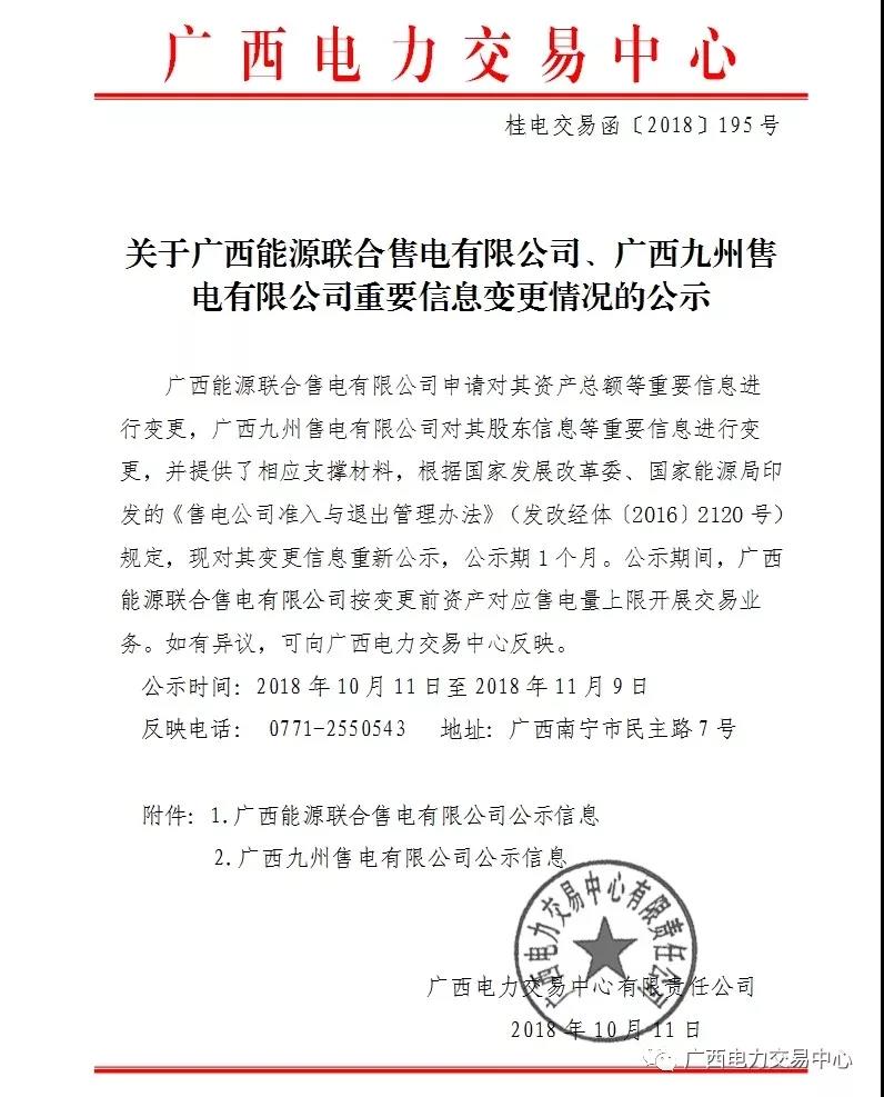 關(guān)于廣西能源聯(lián)合售電有限公司、廣西九州售電有限公司重要信息變更情況的公示