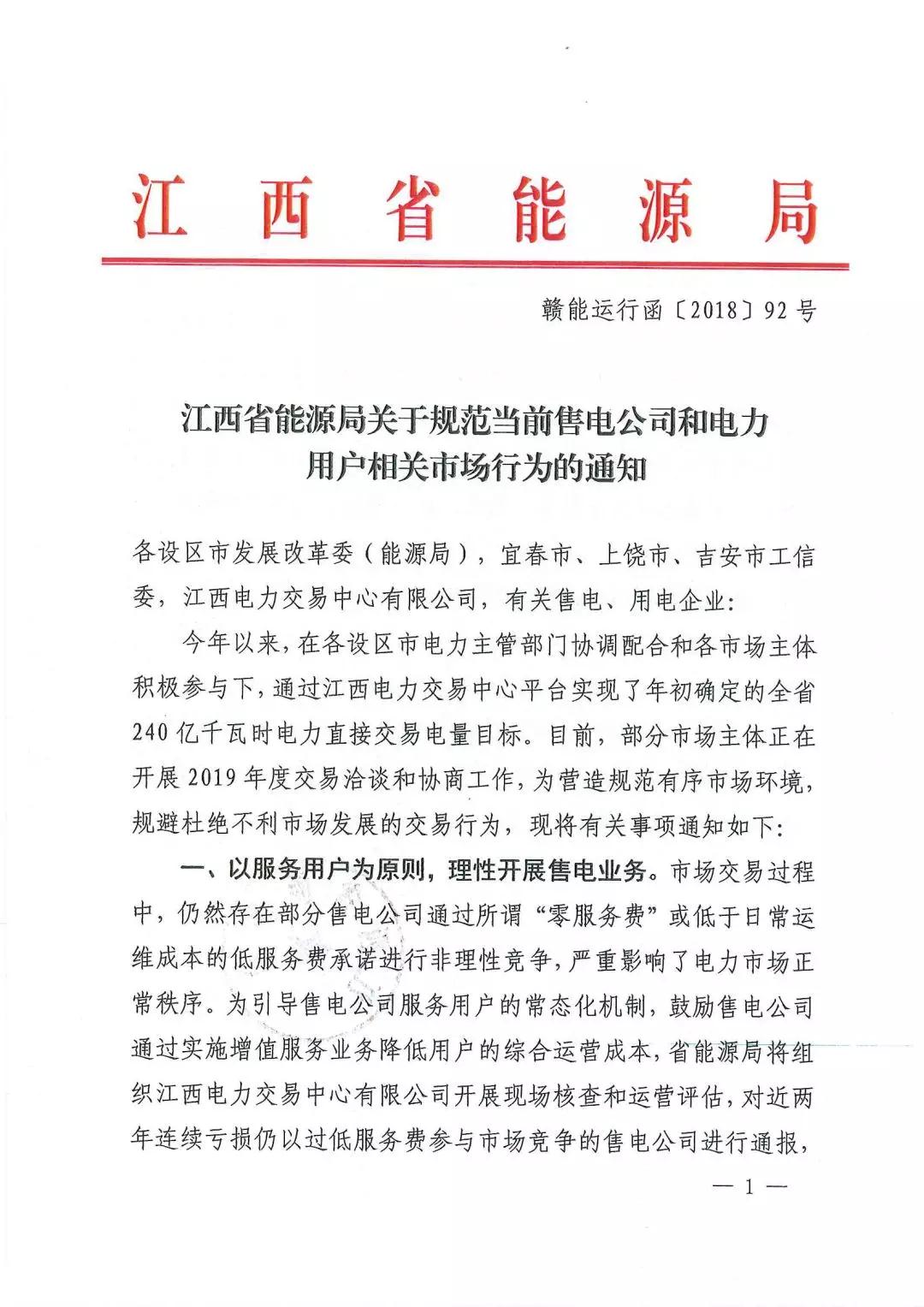 江西省能源局日前發(fā)布了《關(guān)于規(guī)范當(dāng)前售電公司和電力用戶相關(guān)市場行為的通知》,市場交易過程中,仍然存在部分售電公司通過所謂“零服務(wù)費(fèi)”或低于日常運(yùn)維成本的低服務(wù)費(fèi)承諾進(jìn)行非理性競爭,嚴(yán)重影響了電力市場正常秩序,為引導(dǎo)售電公司服務(wù)用戶的常態(tài)化機(jī)制,鼓勵售電公司通過實施增值服務(wù)業(yè)務(wù)降低用戶的綜合運(yùn)營成本,省能源局將組織江西電力交易中心有限公司開展現(xiàn)場核查和運(yùn)營評估,對近兩年連續(xù)虧損仍以過低服務(wù)費(fèi)參與市場競爭的售電公司進(jìn)行通報,情節(jié)嚴(yán)重的,暫停售電公司售電業(yè)務(wù)。
