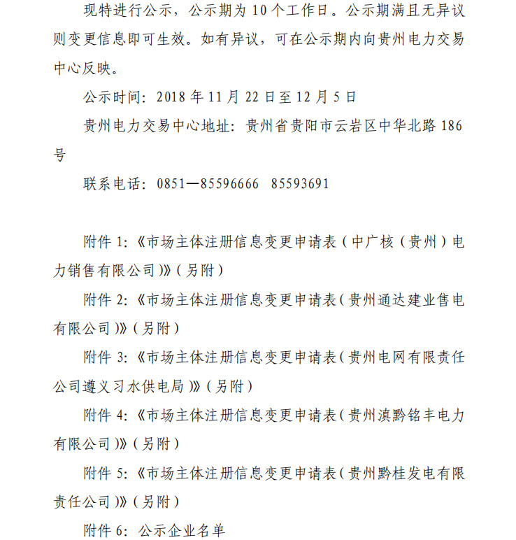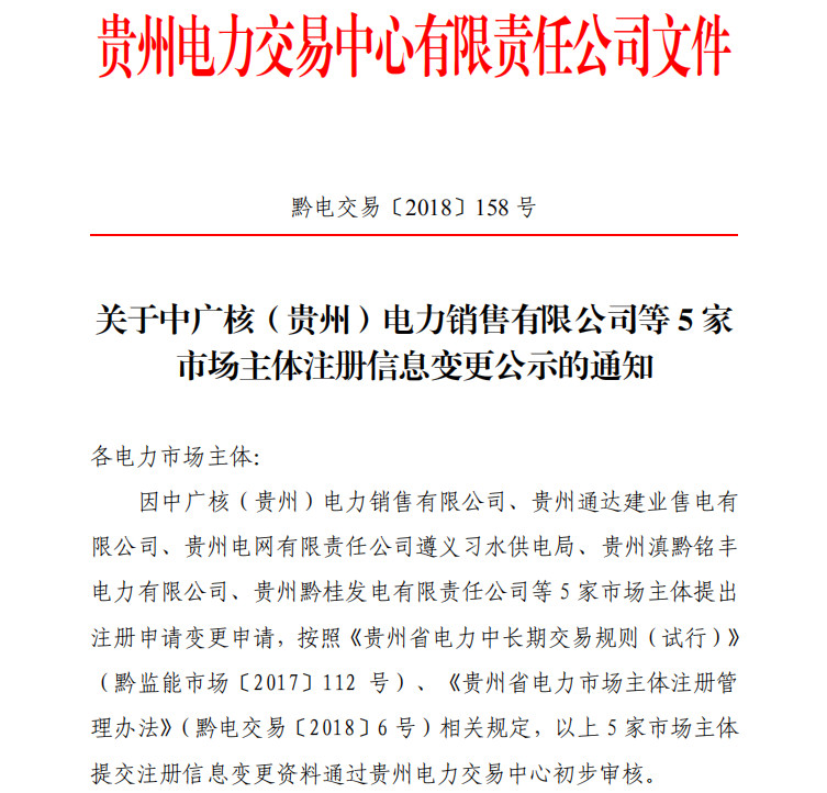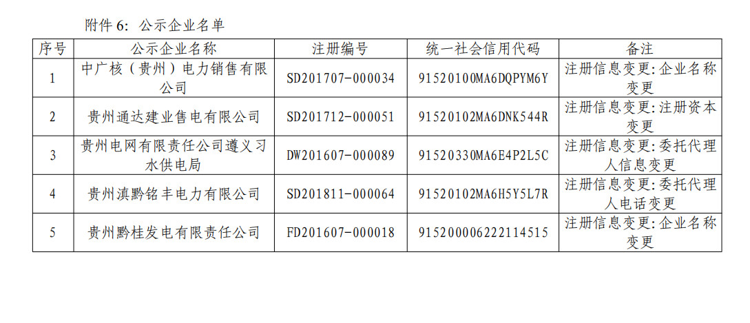 關于中廣核(貴州)電力銷售有限公司等5家市場主體注冊信息變更公示的通知